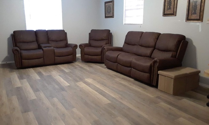 Spacious 2 bedroom home located in the heart of Carlsbad. Beautiful Luxury Vinyl Plank floors thru out the house and Carpet in each bedroom. Both bedrooms are very spacious and fully furnished with a TV and a DVD Player. The south bedroom features a comfortable queen size bed and has a large spacious closet and a Roku TV. The north bedroom features a full size day bed with a very comfortable tempurpedic mattress. It also features a make up vanity, mirror & bench, TV and hair dryer.. Also provided is a 4” inch Tri-Folding Memory Foam Mattress's that the kids and teens alike can use to sleep on, or just relax on while watching TV or playing board games. A memory foam futon couch/sleeper is located in the spacious utility wash room and features a door for privacy. A foldaway comfortable single sleep coleman cot is also provided.