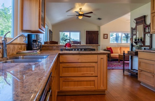 Conveniently located near the heart of Paso Robles on the desirable “West Side,” this lodging in Paso Robles, CA, is just blocks away from everything downtown has to offer. Our 1920s cottage is completely rebuilt with modern & convenient amenities. Cozy, casual & comfortable--And very relaxing! We have the best porch in town awaiting your stay and a beautiful view of Paso Robles’ Centennial Oak tree! It will feel like you’re home ~ in Paso Robles! Paso Robles downtown: restaurants, wine tasting, festivals in the park, 9 screen cinema, Mid-State Fair & the Paso Robles Events Center. Many wine tasting rooms in the surrounding area are a short drive away. Just half an hour away by car you’ll find Lake Nacimiento, and the beautiful coastal towns of Morro Bay, Cayucos & Cambria ~ the gateway to Big Sur. 2 Bedroom/two Bath ~ Sleeps 2 to 4 Two Bedrooms ~ California King Size Beds ~ Dining Area ~ Kitchen & Bath with Granite Countertop ~ Breakfast Bar ~ Dishwasher ~ Beautiful Cherry Hardwood Floors ~ Full Size Porcelain Shower ~ Beautifully Appointed Decor ~ Living Room with Plasma TV, DVD Satellite ~ High Speed Internet ~ Two Mini-Splits for Heating and Cooling ~ Ceiling Fans ~ BBQ ~ Linens & Towels Provided. City Permit #STR19-0192.