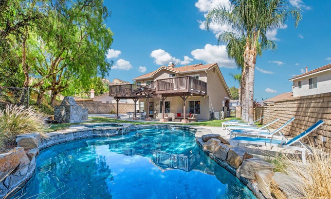 Nestled in the serene Santa Clarita Valley, this luxurious vacation retreat is just minutes from Magic Mountain Six Flags, offering a custom-built backyard oasis with a zen pool and spa. Enjoy ample living space across two floors, ensuring privacy and comfort for all guests. Ideal for escaping the hustle and bustle of LA, the area also boasts stunning hiking trails and convenient access to Valencia Town Center for shopping and dining.