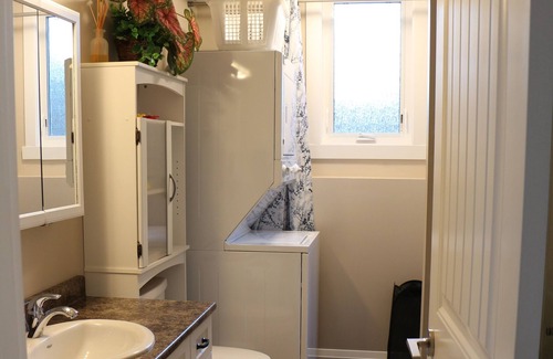 The bedroom has a KING size bed and black-out curtains. A small desk with charging ports completes the space. The in-suite Laundry has laundry soap & dryer sheets for your stay.