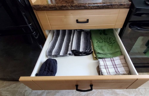 The kitchen is fully equipped including an Insta-Pot, air-fryer, coffee maker, toaster, dishes, pots & pans.