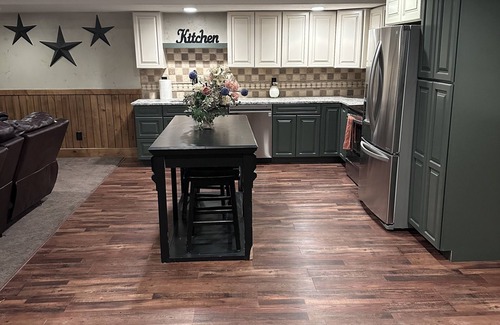 I have a private entry basement apartment that has a full kitchen with a dishwasher full fridge, a washer, and a dryer. Full big living room and three bedrooms can sleep up to 8 people. Has a full bath with a shower.