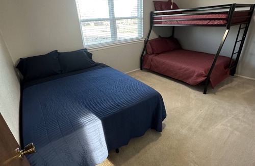 Bedroom 3 has a queen size bed and a bunk bed consisting of a full and twin size bed and closet.