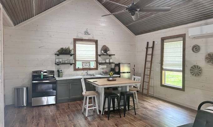 Escape & unwind at this peaceful cozy cabin down by the river! Surrounded by nature including cattle & horses, this is a pet-friendly, one-room spacious cabin with a bathroom, washer/dryer, heat/air, king-size bed and a couch that pulls-out into a full-sized bed. The kitchen is fully stocked with a large island, and a covered outdoor patio with grill and furniture.