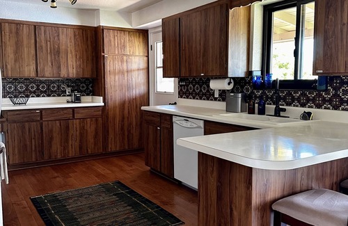 This 1960s ranch home in a quiet West side neighborhood in the foothills of the Tucson Mountains has recently been remodeled with an eye to comfort and water-consciousness and is featured in the Watershed Management Group 2025 Desert Living Home Tour as an example of sustainable desert living. The private pollinator-friendly organic garden in the backyard is sustained by harvested rainwater and visited regularly by hummingbirds, finches, butterflies, native bees, and quail. Over the past several years we have been working on habitat restoration in the previously gravel yard. Every year we add more rain basins and more native-critter-friendly plants! You are quite likely to see our local javelina herd ambling by in the front or along the fenced easement behind the house, and you may fall asleep to a coyote concert. When you sit on the back patio looking over the spacious yard, you'll be able to take in the Catalina mountains, mature mesquite and palo verde trees, magnificent clouds or storms depending on the season, and the occasional hawk or vulture. At night, the moon and stars are radiant and the nighthawks dart through the yard.