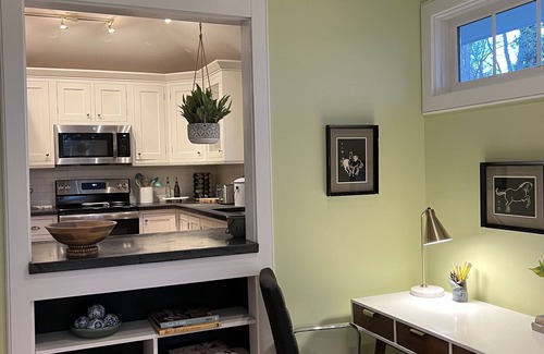 Art-filled with a boho feel, this home sits in a grove of cedars, feeling secluded and restful, but Main Street, filled with shops and restaurants, is just two short blocks away. Vintage touches and charm for days! Fully appointed Chef’s kitchen, designated work space, sunlit den that will have you curling up with a book or a glass of your favorite beverage. Have coffee on the front porch, over looking the cedar grove, or enjoy the secluded back deck.