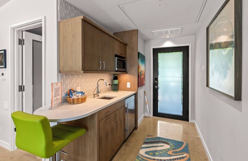 Minimal effort, maximum style. The galley kitchenette might be compact, but it packs a punch with custom wood cabinetry, glossy glass tiles, and a quartz countertop that seems to stretch forever. It's stocked with top-tier appliances like a four cubic-foot Sub-Zero mini-fridge (your snacks deserve the best), a stainless-steel microwave, and a Keurig that matches the decor. Because why not?