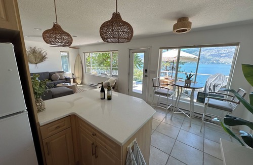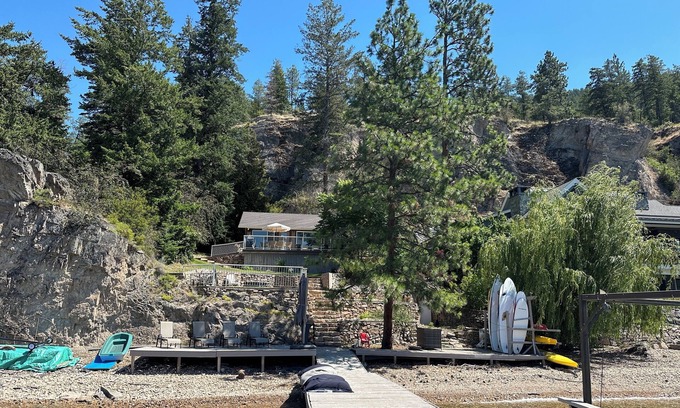 This single bedroom detached house is set right in front of the lake with a great view and easy access to the dock and shoreline. This is a great retreat for a couples getaway. There is a full bathroom with laundry and full kitchen with dishwasher. All you need is your clothes and some food and you can move in to a beautiful lakefront getaway for a quiet week of removal from the busy bustle of life. Have coffee on the dock after hiking or biking in the mountains behind the cottage right out the back door. We are 4 mins from the mountain bike trail head at Ellison Provincial Park. Go for a run on the quiet back road and get some hill training in or just a casual walk through the woods on the many trails in the area. There are also kayaks and paddle boards available for free if you would like to do water activities, or just bring your bathing suit for a soak in the beautiful clear water of Okanagan Lake.