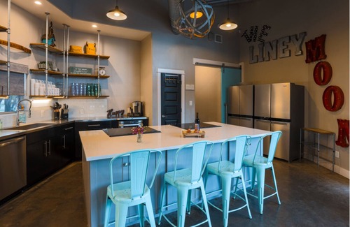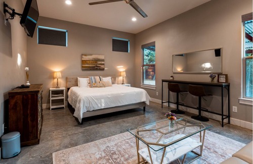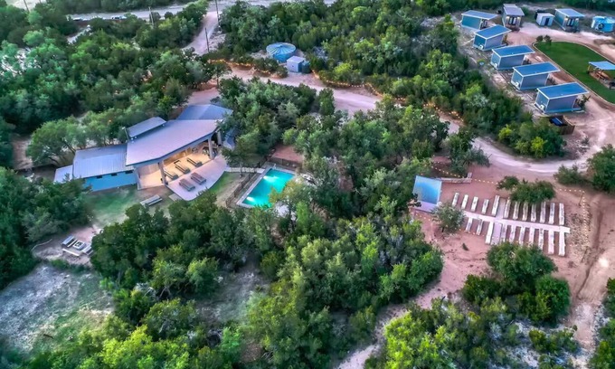 The Liney Moon is a sprawling 8-acre retreat in Dripping Springs ("Wedding Capital of Texas") and is the perfect property for weddings, yoga/wellness retreats, family reunions, corporate retreats, and other group gatherings. This beautiful Hill Country property can comfortably sleep up to 60 guests in three distinct areas of the property: 1) modern industrial styled "Stellar House" , 2) three one-bedroom tiny home "Triplets", and 3) ten unique hotel-suite style "Horseshoe Cottages". The expansive grounds feature a sparkling fenced pool, multiple fire pits, outdoor bar, three grill areas, huge covered patio, putting green, hiking trail, professional grass volleyball court, horseshoes, many outdoor games and much more!