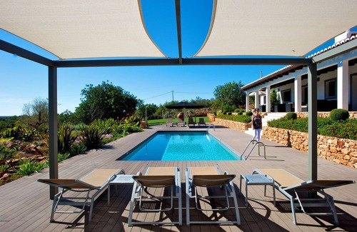 Completed in 2009 in a modern architectural style with a Moorish accent. The villa, suited for 10 persons, has a single floor space of approx. 280m2 and is divided in 5 well-sized bedrooms with each their own exclusive bathroom with toilet. The main living is divided in 2 spaces, one to relax on a large sofa with a fireplace and satellite television, the other with the large kitchen space and dining table. The villa is equipped with all of the modern electronics, such as internet, DVD, integrated music system with iPod-connectivity and a security system on the whole house. The house has a natural air-circulation system, which can be regulated to suit your comfort. So during the summer and winter periods, the house is very comfortable. From the main living, you can enter the roofed veranda where you can choose to relax or to take place on the dining table. Here you can overlook the beautiful scenery and the large pool. Near the terrace, you can find a large outdoor kitchen where you can invite all of your guests and make the most wonderful dishes with fish and meat fresh from the market in Silves. In 2011 a luxurious container is integrated into the total design and offers space for an extra 4 persons. This containers also has all the comfort you would want for a relaxing stay at the villa. In total 14 persons can enjoy the villa and the magnificent Algarve.
