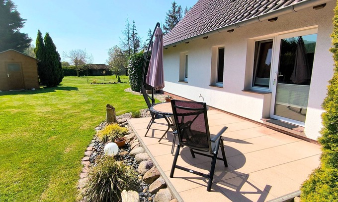 Our approximately 42m ² modern equipped apartment is located on the ground floor of our house with separate entrance in a quiet location. It offers enough space for 2 adults and a child and consists of: A living room with comfortable, pull-out sofa and wooden furniture, satellite TV, CD player and radio. A kitchen with a small dining table and chairs, dishwasher, refrigerator, stove, microwave with grill and convection, coffee maker, kettle, toaster, cutlery and crockery and a beautiful view of the terrace. Bathroom with shower and toilet. As well as a separate bedroom with double bed and large wardrobe, also made of wood. A single bed or Chaise is deliverable if necessary. A free parking space for your car is available on the property, as well as a barbecue. For bicycles there is a lockable garaging.