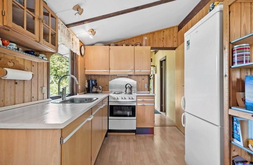 This inviting and cozy wooden holiday home, styled in a classic vacation house manner, features an open layout that combines a welcoming entrance with a spacious living and dining area. It offers three bedrooms, including one with a double bed and two others equipped with a bunk bed and two single beds, accommodating up to six guests. The kitchen area is well-equipped with a cooking range (gas/electric), oven, refrigerator, and coffee maker, perfect for preparing meals. The recently renovated bathroom includes a shower, sink, and toilet. Modern amenities such as Wi-Fi, a TV with German and Danish channels, a DVD/Blu-ray player, and a washing machine ensure comfort and convenience. Outside, a lovely covered south-facing terrace and a west-facing terrace provide ideal spots to relax. Surrounded by a charming garden, this home is just a short walk from the beach, making it a perfect retreat for families.