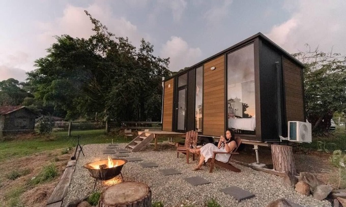 A cozy 139-square-foot tiny home with easy access to water, split air conditioning, a kitchenette, cooking equipment, and excellent bathroom facilities. These amenities include a waterless eco-friendly compost toilet, hand basin, and shower (gas heated for hot showers).
