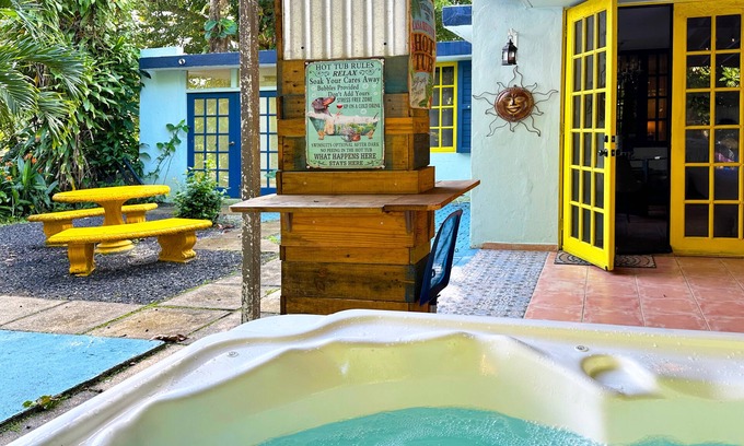 • Large hot tub, tropical garden, and mint for your mojitos!