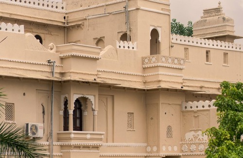 The decor across the palace features antique furniture, jharokhas, and handcrafted art, making every corner picture-perfect.