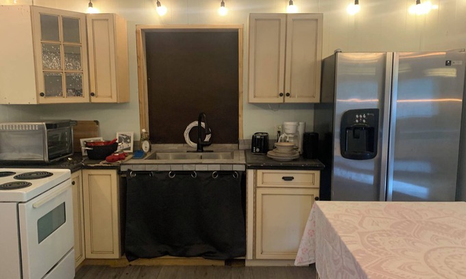 One bedroom ranch house with kitchen and shower. Additional bed in living area. Private gated yard right off highway. Laundry available. On horse farm that has goats and ducks and chickens. Miles of private trails for hiking.