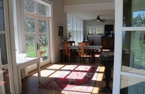 The yard has organic fruit trees and 75 blueberry bushes, which ripen and give you an abundance of anti-oxidants if you are with us in July or August. There are spectacular views, sunlit rooms, and outdoor refuges. Our mountain is cool in the summer, magnificent in the fall and spring, and peaceful in the winter.