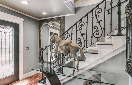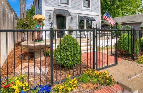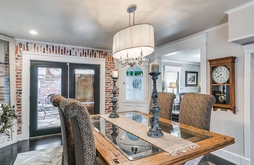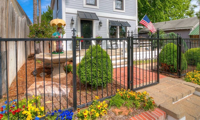 Centered in the heart of Historic Guthrie. Designer landscaping cradles an outdoor sanctuary with a gabled cedar beam and stone paved outdoor living area. Inground pool as well as a hot tub, private courtyards boasting calming water features, mounted TV and brick fireplace offer an entertainer's dream space. Chef's kitchen, commercial appliances, custom amenities, black eucalyptus flooring, designer paint, open living, brick features, high-end finishes with old world charm throughout. NO pets allowed.