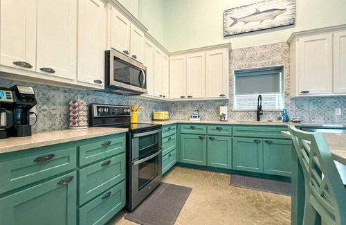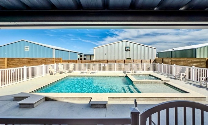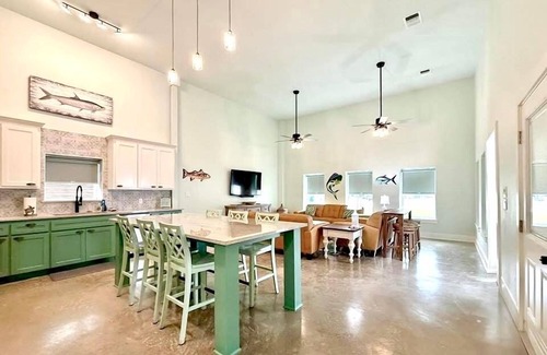 Red Drum Retreat: Port O'Connor's luxury 5 bedroom 4.5 bath with a pool, hot tub, game room and a kitchen built for entertaining. 3 King en-suites, 1 Queen en-suite, double twin room. Outdoor living area has a fire pit, large dining table, bbq grill under a covered area for all weather conditions. The shop is loaded with entertainment. Come to fish, play, shop, dine and gather with your friends and family. There is loads of boats and cars. We promise you will make it a repeat vacation spot!