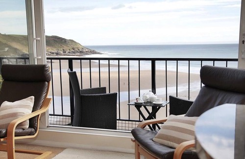 Outside : balcony with wicker furniture and sea views.