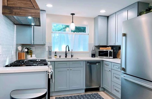 All brand new and stylish! The master bedroom has a king memory foam bed with a view of the backyard and the second bedroom has a queen memory foam bed and office nook. TVs in both bedrooms and living room. You'll get to enjoy modern amenities including a mini split heating and cooling system, reverse osmosis purified drinking water system, rainfall shower for a relaxing cleanse, cotton linens and a fully stocked kitchen for the chef in your group.