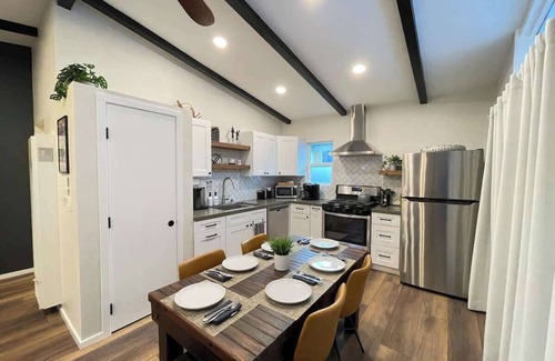 Each home is newly remodeled and modern. The "Redwood Oasis" home has views of the sparkling blue pool off the living and dining areas. Inside you'll find the master bedroom with king bed and a second bedroom with three twin beds (bunk and single). On the other side of the pool is "Redwood Grove" - A home with two bedrooms (one with a king bed plus garden view and another with a queen bed plus office nook), and private enclosed patio. "Redwood Nook" is a cozy studio bedroom with a kitchenette and bath with a front entrance facing the backyard. All homes are fully stocked with all your cooking and dining essentials. Around the pool you'll find sun loungers, pool toys, BBQ grill and fire pit.