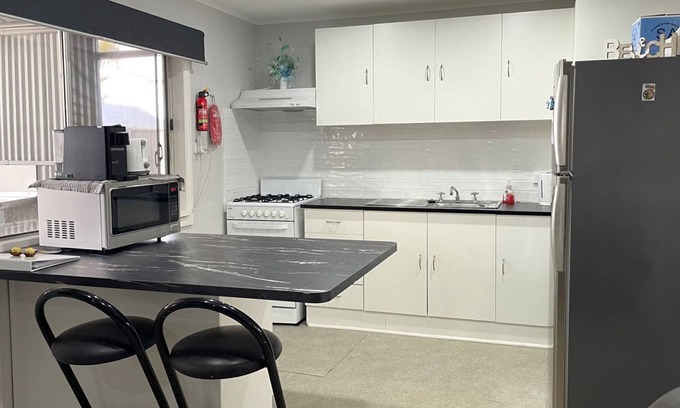 PROPERTY DETAILS: 2 bedrooms - queen; trio bunk (double on the bottom, single on the top). Sleeps 5; Quilts and pillows provided – BYO sheets, pillowcases, towels, bathmats & tea-towels OR optional linen hire $110 available through Country Getaways office; optional linen service fee $50 for beds to be made up. Bathroom with bath, walk-in shower, vanity & toilet. Reverse cycle air-conditioning in lounge room; Pedestal fan. Master bedroom has television. Television with USB & HDMI ports in lounge room; DVD player; DVDs; Video player; Board games. Compact well equipped kitchen with gas stove, microwave, coffee machine (guests need to bring Espressotoria pods or purchase locally), & medium fridge with freezer on top; Small kitchen appliances including kettle & toaster. Front load washing machine; Clothes airer; Foldup clothesline in yard. Fenced yard; Large undercover entertaining area; Dining & lounge seating; Outdoor kitchen facilities in entertaining area; Hooded gas barbecue. Fire pit (guests need to bring their own wood & observe fire regulations). Seating under rear veranda. Fish cleaning sink. Off-street parking for up to 2 cars & a boat behind fence; No garage access for guests. 5 minutes’ walk to Port Victoria foreshore. Pets by arrangement only ($100 refundable bond applies per pet) - inside pets accepted.