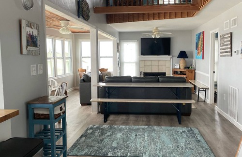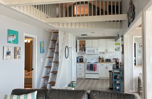 The house is a 2 bedroom 2 bathroom plus loft. King bed in master bedroom with attached full bathroom with shower and tub. Queen bed in second bedroom. Second bathroom is also complete with shower and tub. The loft area has 4 twin beds that are great for kids! The best part of the house is the wall of windows overlooking the beach, in the open living room/dining room. There is a large table that seats 8 people with a smaller breakfast bar with three stools.