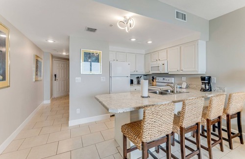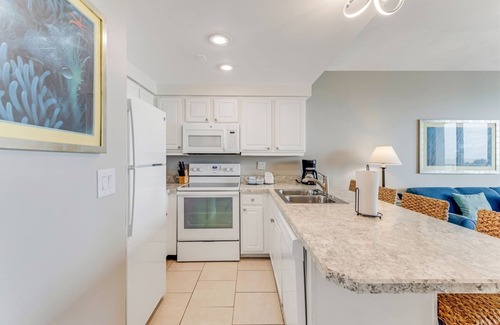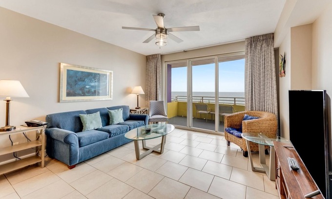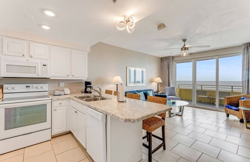 The bedroom features 2 full size beds with inviting beach decor. The living room continues the beachy feel of the bedroom with a large ocean front balcony. The couch in the living room opens into a queen sleeper to maximize occupancy. There is a full kitchen opening into the living room, so everyone has an ocean view. This kitchen has everything you need so just go pick up the groceries. The unit also has it's own washer and dryer. Every room has a large flat screen tv with cable which is great for winding down after a long day of fun in the sun.