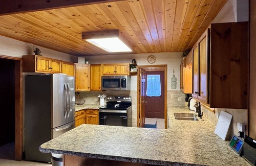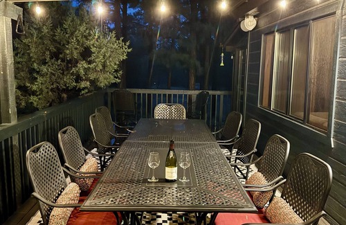 This is a 3 bedroom 2 bath well furnished two-story cabin/house on a wooded 1 acre lot. There is a large front deck with a gas grill and shaded seating perfect for family meals. Outdoor seating for 10. There is a swing and yard toys for additional entertainment outdoors. Inside enjoy WiFi, Smart TV, DVD player as well as an enclosed sun room with plenty of toys and board games for kiddos. The granite countertop kitchen is fully equipped. Everything you need for a family friendly getaway is readily available including baby gear such as a pack n play, high chair, baby gates, and booster seat. Due to recent forest fire activity we no longer allow fires outside in the fire pit.