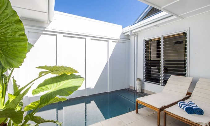 Guests enjoy private courtyards with large temperature controlled plunge pools, king size bedroom suites, separate living pavilions, BBQs and views across the bay.