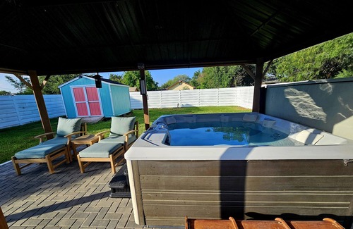 amplio patio enfrente y en la parte tarsera ideal para mascotas de raza media, ademas cuanta con un area de relajacion con jacuzzi exterior con temperatura controlada, 2 pergolas ,camastros, asador, sala de estar con smart tv para que puedas disfrutar tus peliculas favoritas con tus amigos y familia , no dejes pasar esta oportunidad y ven a disfrutar tu estancia con nosotros.