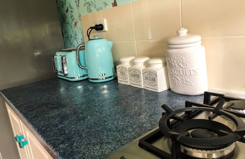 The kitchen is cosy, providing everything required for your holiday: a gas stove, convection microwave oven, air fryer and large fridge freezer, plus Delonghi coffee pod machine, with pods provided for arrival.