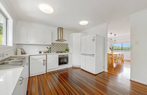 RELAX with a cool drink and BBQ on the deck of our coastal home. Outdoor table setting for 8 with ocean and bushland views. The home also has two other dining areas, large spacious 8 seater dining table which enjoys coastal breezes plus another dining area in the open plan kitchen/dining area.