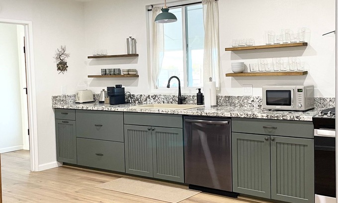 Relax and unwind at the beautifully renovated Sage House! Designed with comfort and functionality in mind, Sage is stocked with all you need for a peaceful desert vacation. After enjoying the swimming pool, find a lounge seat on the deck, or sway in the hammocks. Enjoy a BBQ grilled meal on the shaded patio, and have a fire under the night sky. Hop in the hot tub for a soak before enjoying a cup of chamomile tea and curling up in the plush king size bed! Cook breakfast at home in our fully stocked kitchen, and enjoy a cup of coffee from the Nespresso or French Press. Fully fenced and ideally located, the Sage House has it all. Lay by the pool all day, or drive 10 minutes to downtown, or 15 minute to Joshua Tree National Park!