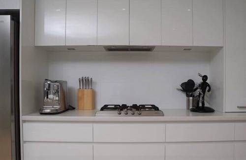 Open plan kitchen with dishwasher, fridge/freezer, gas stove top, oven, microwave, Breville Nespresso coffee pod machine (BYO pods), dining area, split system reverse cycle air-conditioner, lounge area with TV, DVD, Foxtel, ceiling fan.
