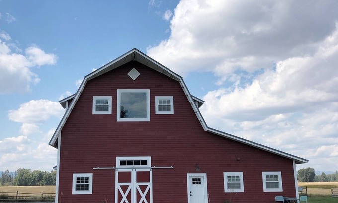 Our second story loft style apartment is decorated in a farmhouse vintage style. The happy red barn is a new addition to our farm which has been nestled on our quiet country road since 1918. The farm is conveniently located at the center of all the Flathead Valley has to offer: