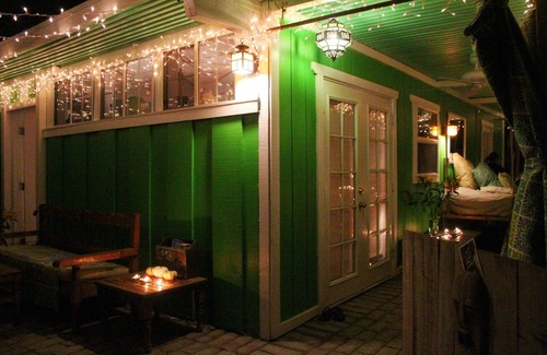 Our 800 sq ft wraparound cobblestone porch overlooks our beautiful peaceful street and expands our bungalow into an outdoor environment, with its dining table for 12 made from 100+ yr old barn wood. Close our outdoor curtains for even more privacy as you lounge on the hanging bed and take in the scent of the fresh flowers along the perimeter of the veranda. Ahhh...