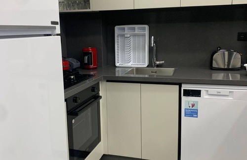 Fully equipped kitchen with all essentials, including a latest-model barbecue and pour-over coffee maker.