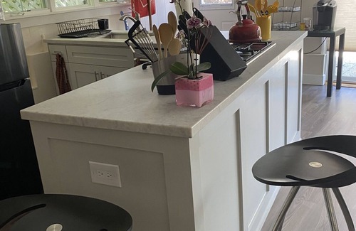 The generously proportioned cottage is open concept and loft-like in its layout. Due to its loft like open concept design, the stairs in the cottage and the outdoor pool, the cottage is suitable for children over the age of 12. The cottage is a separate structure with its own private entrance. There are floor to ceiling French doors at the front of the cottage leading to a beautiful patio area for relaxing in our beautiful California weather and for dining Al Fresco. The ground floor of the cottage houses the Living Room, Dining and Kitchenette. There are two Pottery Barn down filled sofas. One of the sofas is a pull out double bed. There are two side tables and a coffee table. There is WiFi, Apple TV, and Roku, (live TV is available through the Sling streaming App on the Roku device). There is a Modern Italian Dining Table with seating for four (there are an additional two chairs available if necessary). Three bar stools for the kitchen/bar counter. A console with the coffee station (Nespresso Original Line with espresso pods, Keurig Coffee Maker with K-cups, Mr. Coffee Appliance, and a French Press). There is also a compact work desk with a table lamp and chair.