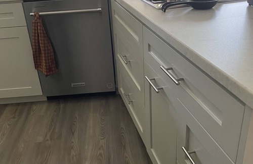 The kitchenette offers a compact refrigerator and freezer, Kitchen Aid Dishwasher, microwave, sink with garbage disposal, and a high-end large capacity Breville Smart Oven. The kitchenette cupboards hold linens, dishes, bowls, mugs, and glasses; a full set of cutlery with many kitchen gadgets in a drawer as well as a stove top kettle and electric kettle. A Panini Press, crock pot, Indoor electric grill, cooler, and picnic gear are available for the use of our guests during their stay. We have stocked the cottage pantry with basic herbs, spices, salt, pepper, oil and vinegar. We also provide an initial supply of paper products (paper towels, napkins, paper plates, and plastic cups for use around the pool, etc.).