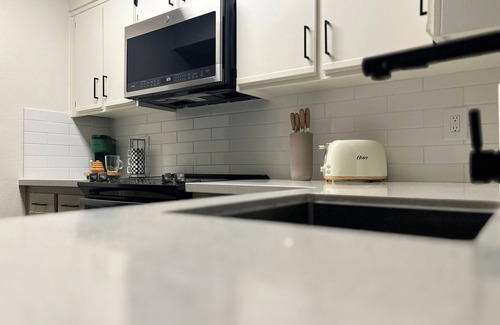 Welcome to your modern, escape in a peaceful gated community, ideally situated near everything you want to see and do. This clean and thoughtfully designed 2-bedroom, 1-bath condo features a king and queen bed, perfect for couples, small families, or business travelers seeking comfort and simplicity.