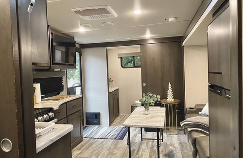There is a mini-fridge, stove top, microwave & hot shower and Smart TV with full reclining movie theatre chairs. We provide Silverware, dishes, pots/pans, keurig coffee pods, salt, pepper, sugar & olive oil are provided as well.