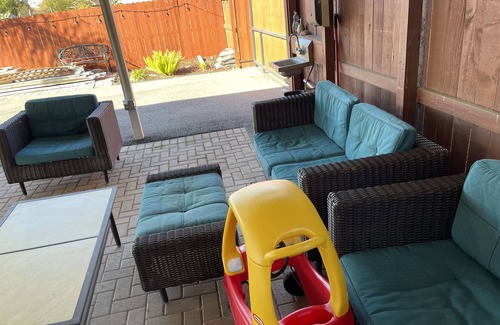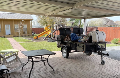 Relax with the family and enjoy a peaceful stay at this location. Plenty of parking space on an 1/2 acre property. Great for family gatherings. Large BBQ Pit ready to be turn on with cut pieces of mesquite on site. Outside TV and tables and chairs under the patio with view to the swing set and trampoline for kids to enjoy. Also a place for s’mores and enjoy the night watching the bright stars. Garage not available but house has a carport that fits two vehicles. Water softener system, feel the difference when showering or washing your hands.