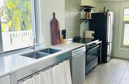 The kitchen opens wide to the deck through a sliding stacker window, making entertaining a breeze.