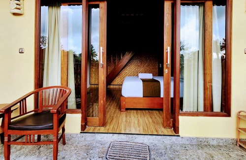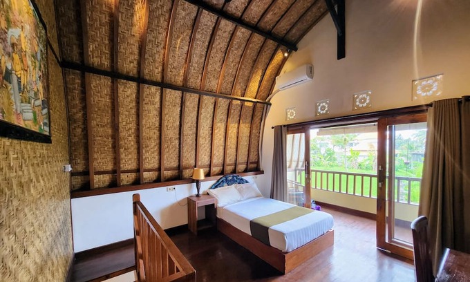 Downstairs Bedroom: A cozy, air-conditioned bedroom with a comfortable queen-size bed draped in soft linens. Wake up to picturesque views of the surrounding rice fields and garden.