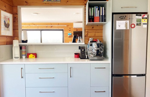 The kitchen has a bread maker, coffee machine and coffee grinder.