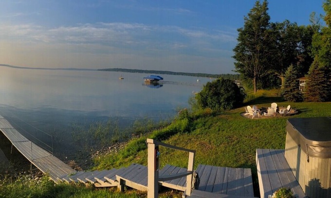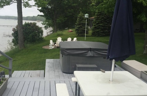 Come and escape to this remodeled cottage with over 150 feet of lake frontage. Sit and relax in the living room only 12 feet from the waters edge or lounge in the chairs on the deck while enjoying the view. Dip in the hot tub as you stargaze. Enjoy the best sunrise from the living room. The 2 bedrooms on main floor include a queen bed in the master bedroom with a private bathroom and a king bed in the guest bedroom. The bathrooms have tiled showers. Narrow staircase to upstairs consists of 4 twin beds in 2 separate areas, there is a low ceiling which makes it a perfect place for children. In addition, there is a small playhouse with a twin bed loft for one who wants to venture and sleep in the woods. An outside gas grill, patio table and 4 chairs make for a lovely outside dining experience in the summer. You can also roast marshmallows and gather around the fire pit at night. A private dock allows for easy lake access where you can fish right off of the dock! To complete your stay, kayaks and life vests are provided. The water on the west side of Burt tends to be calm. Would recommend water shoes due to rocks on the shore.