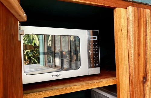 The cottage includes a compact but well equipped kitchenette with everything you need for simple meals, a two burner hot plate, pots and pans, utensils, a kettle, and a mini fridge. Whether you are preparing fresh fruit and coffee in the morning, cooking dinner to enjoy on the terrace, or making a late night snack, the kitchen setup offers ease and convenience. Many guests like to shop at Port Antonio’s colorful markets and bring back fresh produce, seafood, and spices to cook meals that taste like Jamaica, right in their cottage.
