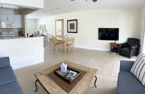The large master bedroom is separate from the guest bedrooms for privacy and features an on-suite bathroom with modern custom tile walk-in shower, a king-size bed, loveseat and flat screen TV/cable. The guest bedrooms include one queen-size bed (with TV) and two twin-size beds. All bedrooms are newly tiled with wood plank porcelain tile. The guest bath features custom tile with shower-over-tub.